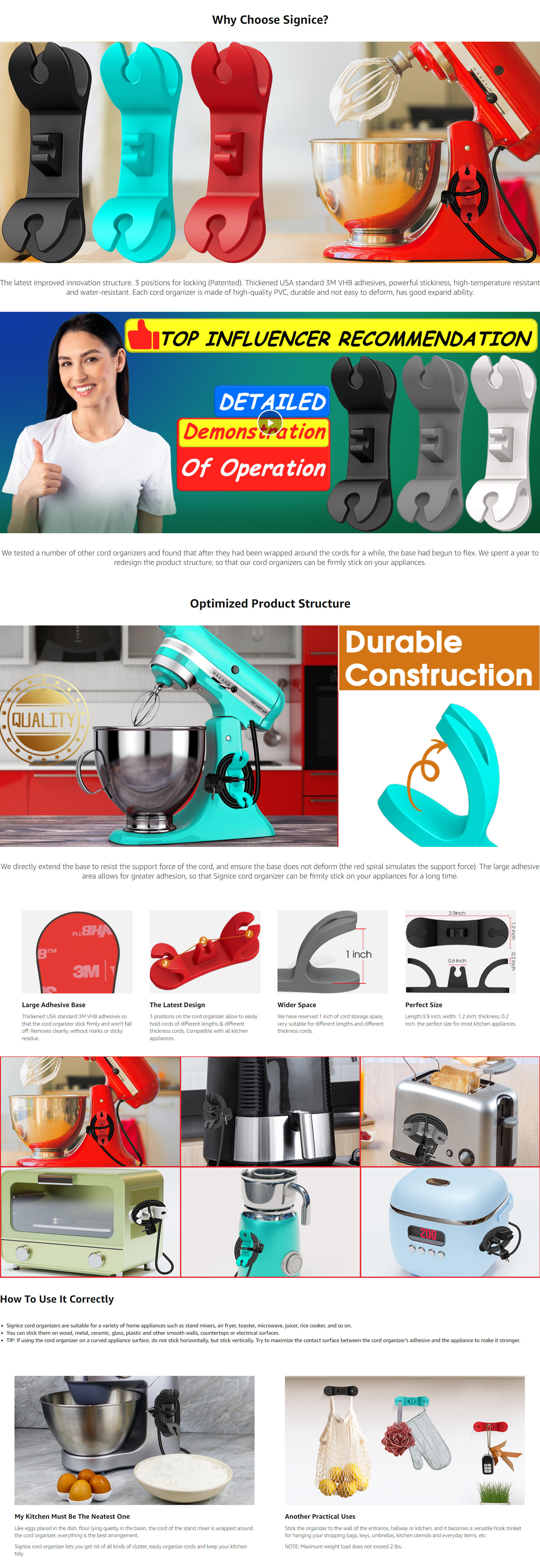 POWERFUL STICKINESS - Unlike other brands,we will never ignore the details. Signice use thickened USA standard 3M VHB adhesives, powerful stickiness, high-temperature resistant and water-resistant, and you don't need to worry about falling off like other brands. After fixing our cord organizer on your kitchen appliances, you only need to wait for 30 seconds to use, unlike other brands that need to wait for half a day.