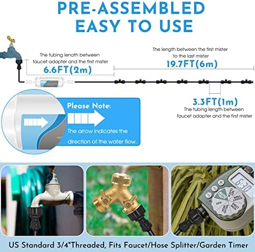 EASY TO INSTALL - This misting system is completely pre-assembled, our US standard 3/4" adapter widely adapted to garden connectors, outdoor faucets, hose diverter, etc. Just connect it to the faucet and it works. Accessories and user manuals available, your misting ideas can be realized in just a few minutes.